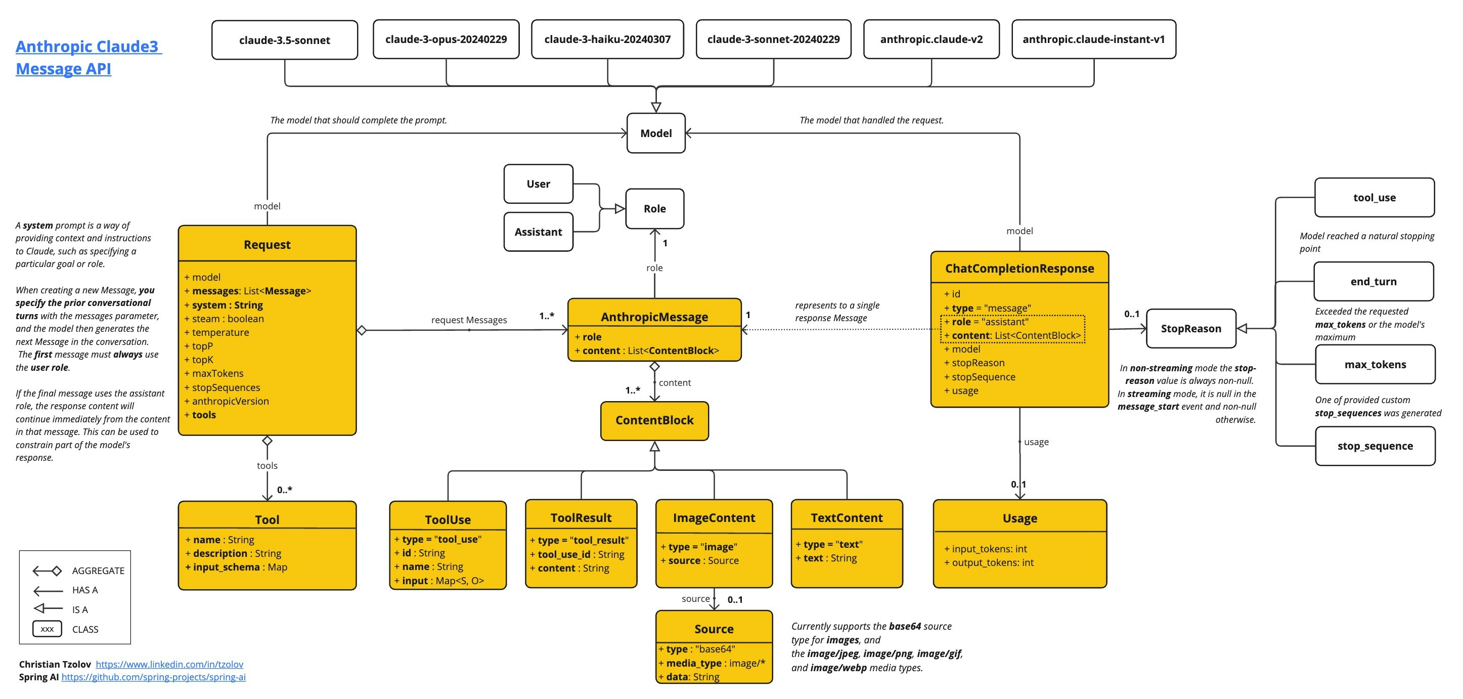 AnthropicChatModel 实现了ChatModel 和 StreamingChatModel,并使用低级 AnthropicApi 客户端连接到 Anthropic 服务。